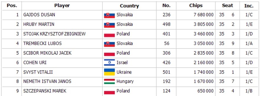 Po dlhých deviatich hodinách hry sme spoznali hráčov finálového stola, na ktorý sa ako posledný nedostal poľský hráč Jendrek, ktorý si za desiate miesto odniesol 857€. Chipleaderom finálového stola bol domáci Dušan Gajdoš so stackom 7.680.000, čo bol dvojnásobok druhého Martina Hrubého.