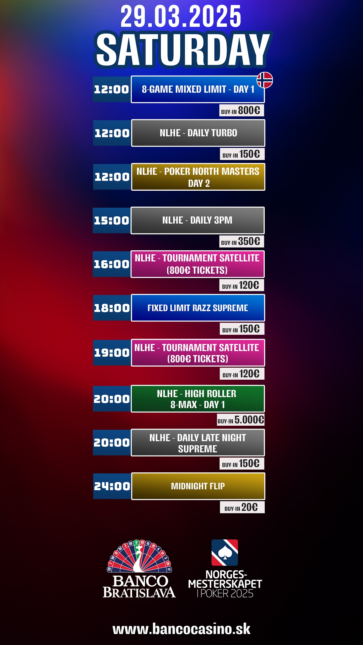 Množstvo turnajov čaká na svojich víťazov a možno tým víťazom budete práve vy. Každý prizepool má niekoľko desiatok tisíc eur, ktoré si rozdelia tí najúspešnejší. Celý harmonogram Norges – Mesterskapet si môžete pozrieť na odkaze nižšie.