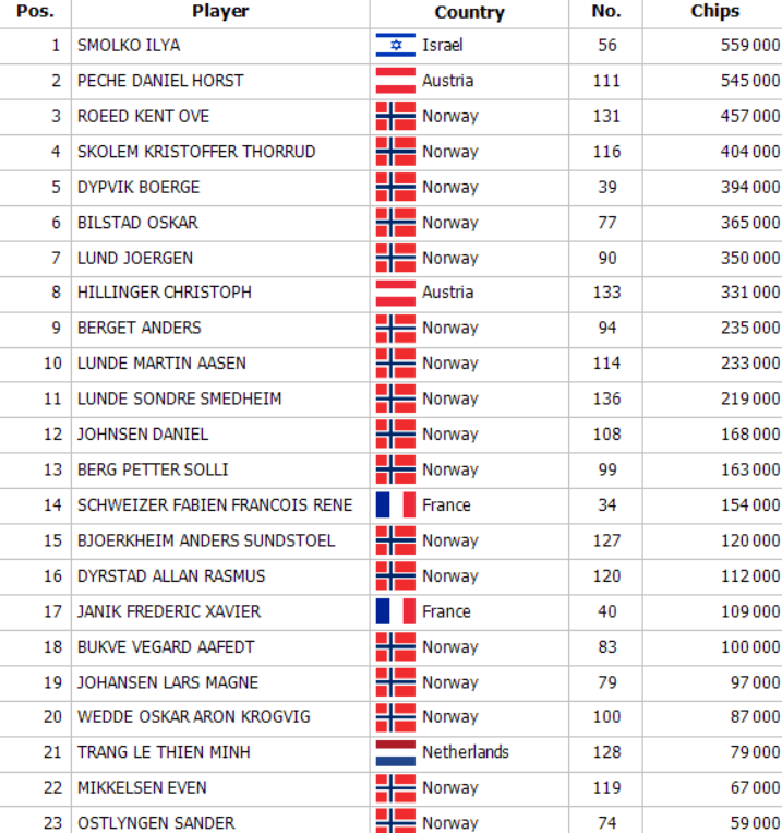V piatok sa odohral aj druhý z dvojice úvodných hracích dní turnaja Poker North Masters, do ktorého bolo vstupné nastavené na 800€ (720€ + 80€). Včerajší hrací deň priniesol ďalších 108 vstupov, ktoré znamenajú prizepool turnaja takmer 100.000€. Po štrnástich leveloch, ktoré musel „prežiť“ každý, kto sa chcel dostať do Day 2, zostalo v hre 23 hráčov. Tí sa stretnú už dnes v Day 2 a zabojujú tak o zaujímavé finančné odmeny. Na víťaza čaká odmena 22.890€.