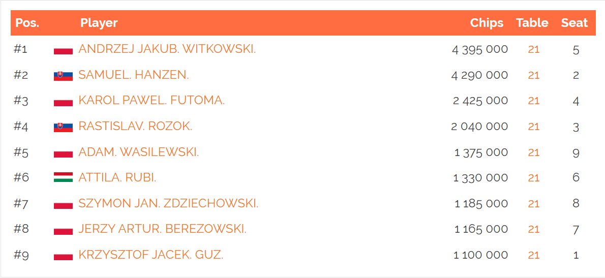 Včera sa stretlo v boji o titul posledných 38 hráčov, ktorí mali zálusk na hlavnú výhru 12.000€. Po niekoľkých hodinách hry sme po vyradení Dušana Zisa spoznali osadenstvo finálového stola, na ktorom mal každý z hráčov k finančnej odmene prirátaný aj 100€ tiket na najbližší Košice Weekend. Najlepšie to mal rozohrané Jakub "Luman" Witkowski, ktorý vlastnil 4,395,000 chipov.