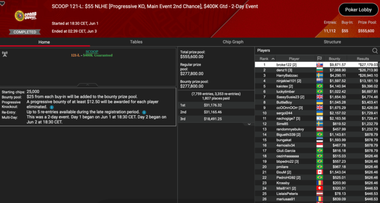 Z titulu sa tešila aj štvorica Slovákov – zmye, adkaf, 8gam€ a broke 122. Práve slovenský hráč „broke122“ bol jeden z posledných víťazov vďaka triumfu na SCOOP 121-L: $55 Main Event 2nd Chance, kde získal spolu viac ako 37.000$ po 3-way deale.