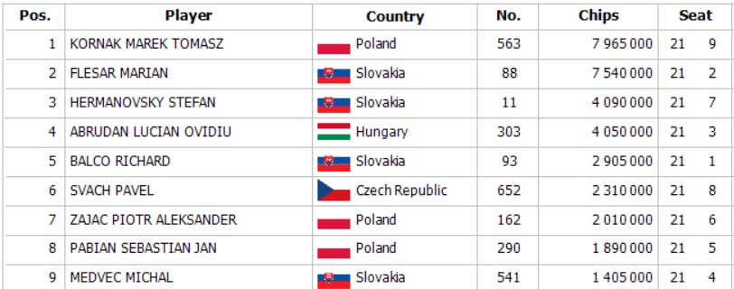 Obsadenie finálové stola sme spoznali krátko pred jednou hodinou ráno, kedy turnaj opustil Lechowicz na desiatom mieste za 1.332€. Stretlo sa na ňom viacero národností no Poliak Marek Tomasz Kornak zasadol na stoličku chipleadera pred Mariánom Flešárom. Kornak mal pred sebou takmer 8 miliónov chipov a druhý Flešár 7,5 milióna.