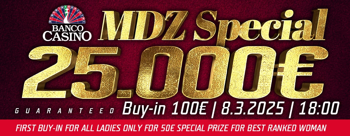 POZOR SÚŤAŽ: V spolupráci s Banco Bratislava sme si pre Vás pripravili súťaž o 5 x 50% zľavu na sobotný MDŽ Special, vďaka ktorému si o 25.000€ garanciu môžete zahrať len za 50€. Pre zapojenie sa do súťaže stačí dať like na súťažný post na našom FB, mať like na stránku Banco Bratislava a do komentára označiť jedného kamaráta, s ktorým by ste si tento turnaj chceli zahrať. Ukončenie súťaže bude v sobotu o 12:00, kedy vyhlásime mená výhercov. Veľa šťastia!