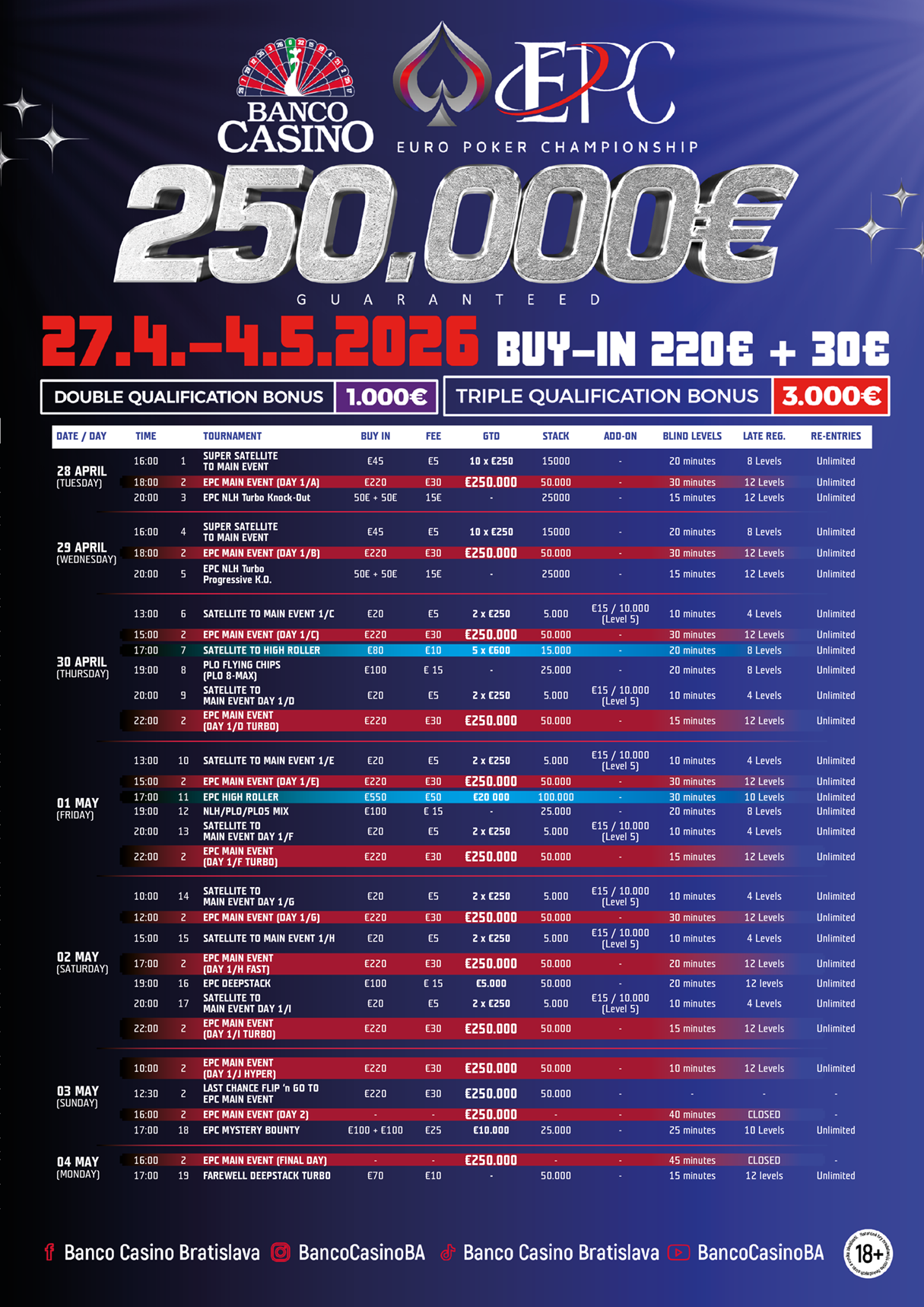 Najväčším lákadlom bude rozhodne Main Event Euro Poker Championship, ktorý prinesie 250.000€ garanciu pri 250€ buy-ine. Tešiť sa môžete aj na kvalifikačné bonusy za viacnásobný postup. Za dvojitú kvalifikáciu získate rovných 1.000€ a za trojitú krásnych 3.000€. Úvodné hracie dni Main Eventu budú prebiehať od utorka 28.apríla až do nedele 3.mája, kedy sa odohrá aj Day 2. Šampióna spoznáme až v pondelok 4.apríla, ktorý si z Banco Bratislava odnesie poriadnu výhru.