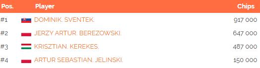 Včerajší večer priniesol flight s označením 1C, do ktorého naskočili hráči celkovo 44 krát. Toto číslo ani zďaleka nestačí na naplnenie garancie, z ktorej je aktuálne vyzbieraných 16.050€. Finálovú miestenku si tak zabezpečili štyria hráči na čele s domácim Dominikom Sventekom, ktorý zabaili 917.000 chipov.