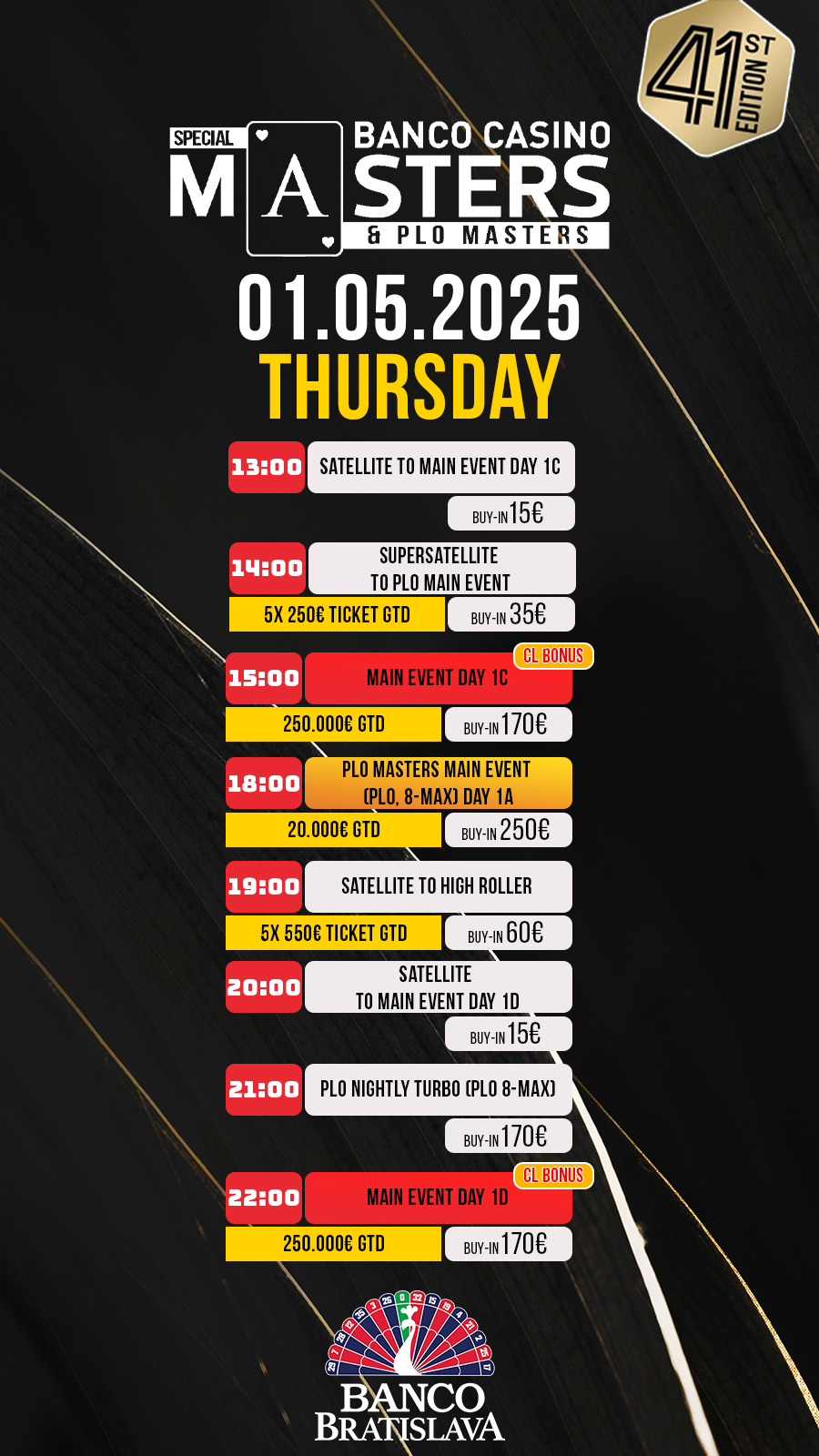 Dnes má Main Event Banco Casino Masters na programe až dva flighty, v ktorých môžete zabojovať okrem postupu do Day 2 aj o Chipleader Bonus. Flight 1C štartuje už o 15:00 a o 22:00 bude pripravený flight 1D Turbo. Máme dobrú správu aj pre fanúšikov PLO, pretože dnes o 18:00 odštartuje aj Day 1A PLO Masters Main Eventu s garanciou 20.000€.