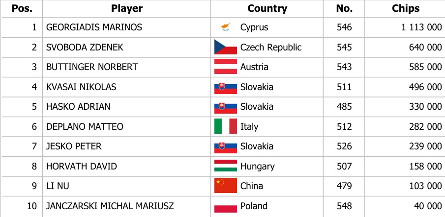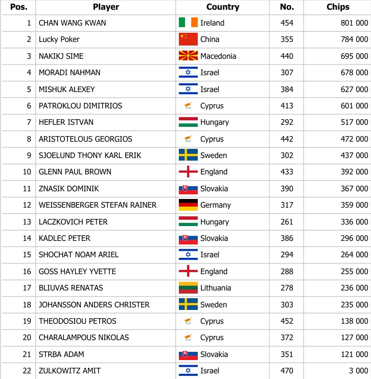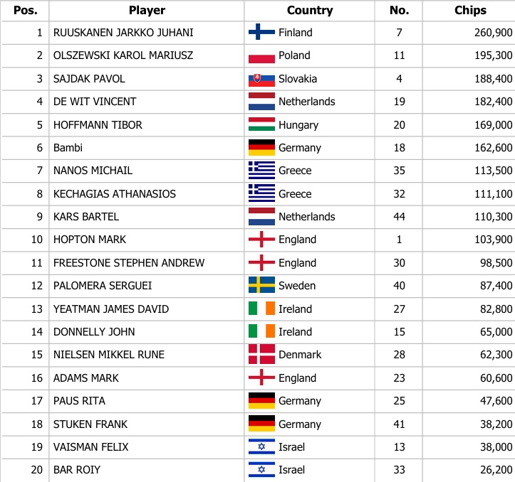 Dva včerajšie flighty Main Eventu priniesli dokopy 319 entries. Najskôr sa vo flighte 1C tešilo z postupu 22 hráčov vďaka 219 entries a neskôr vo flighte 1D Turbo ďalších 10 hráčov vďaka 100 entries. Až šesť hráčov získalo Chipleader Bonus a ten najvyšší, ktorého výška je 1.500€ si zobral Wang Kwan Chan z Írska a Marinos Georgiadis z Cypru.