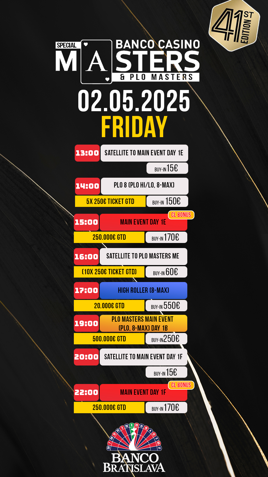 Dnes to bude v Banco Bratislava vrieť aj vďaka plánovanému Highrolleru s garanciou 20.000€. Vstupné má výšku 550€ a štartovný stack až 100.000 chipov. Kto sa stane najlepším z najlepších? Odpoveď na otázku začneme zisťovať už od 17:00. Okrem toho sú na programe aj dva flighty Main Eventu a to o 15:00 resp. o 22:00.